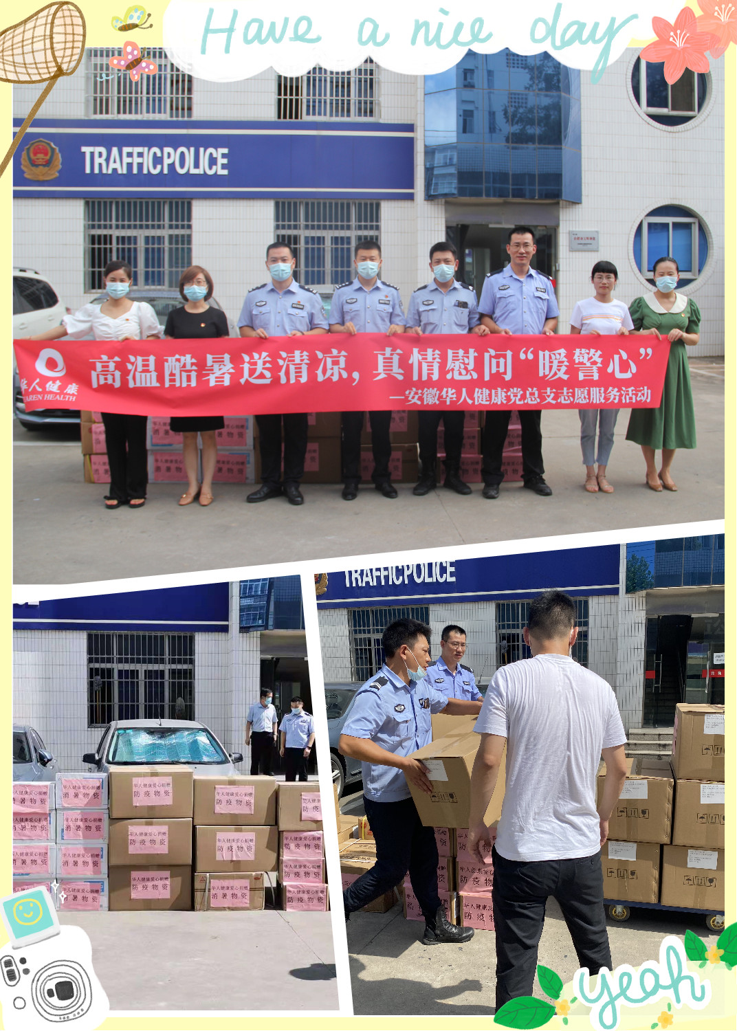 志愿者们将藿香正气丸、C胞活力水、潘高寿龟苓膏等消暑物资以及口罩、酒精、84消毒液等防疫物品交到警员们手中。以国胜大药房党支部副书记刘见侠同志为代表的党员一行对警员同志表示亲切慰问,感谢每一位交警队员的辛苦付出,让我们在炎炎夏日不用为拥堵的交通而烦忧,不用为严峻的疫情而焦虑。
